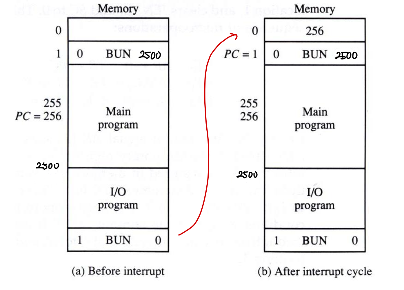 0 BUN 2500: 이 명령어를 주소 1에 배치하여, 인터럽트가 발생할 때마다 주소 2500에서 시작하는 출력 프로그램으로 이동하게 된다.