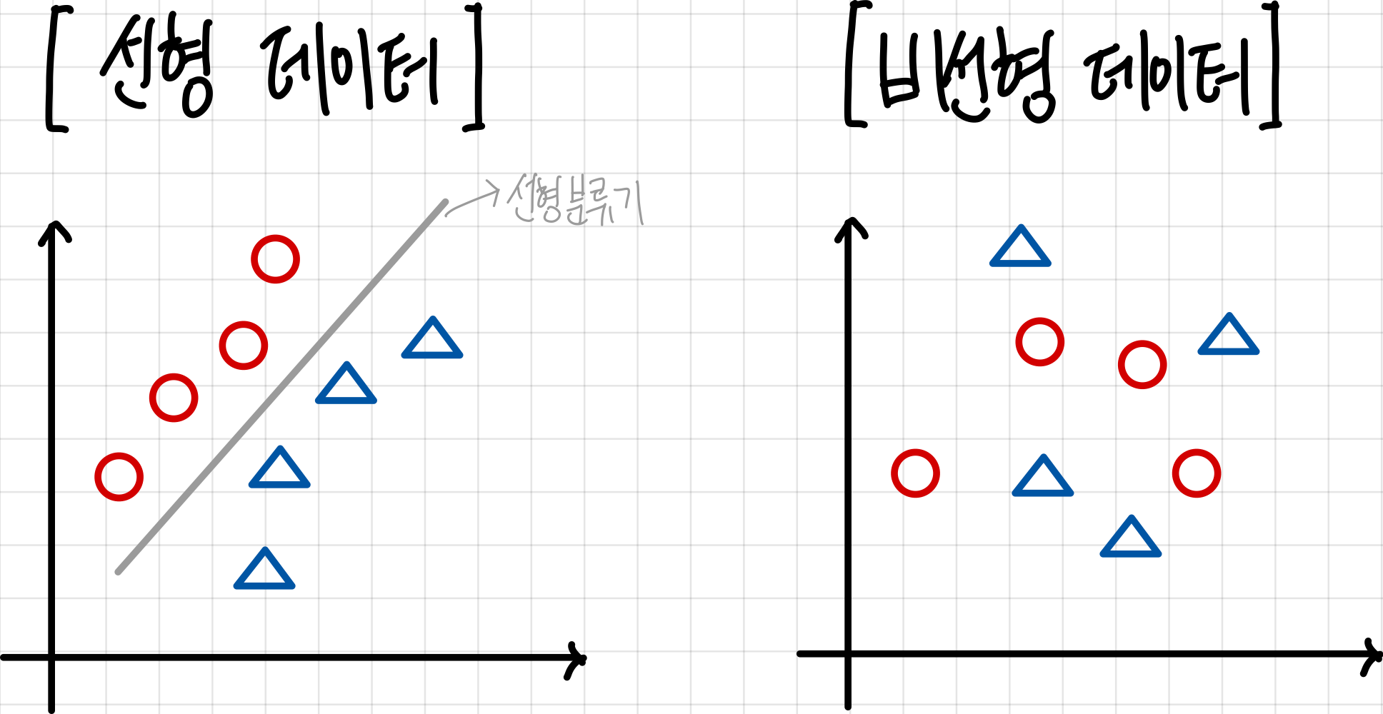 이렇게 [왼 쪽 그림]선형 데이터는 쉽게 선형 분류기로 분류가 가능하다. 하지만 [오른 쪽 그림] 비선형 데이터는 선형 분류기로 분류가 어렵다.
