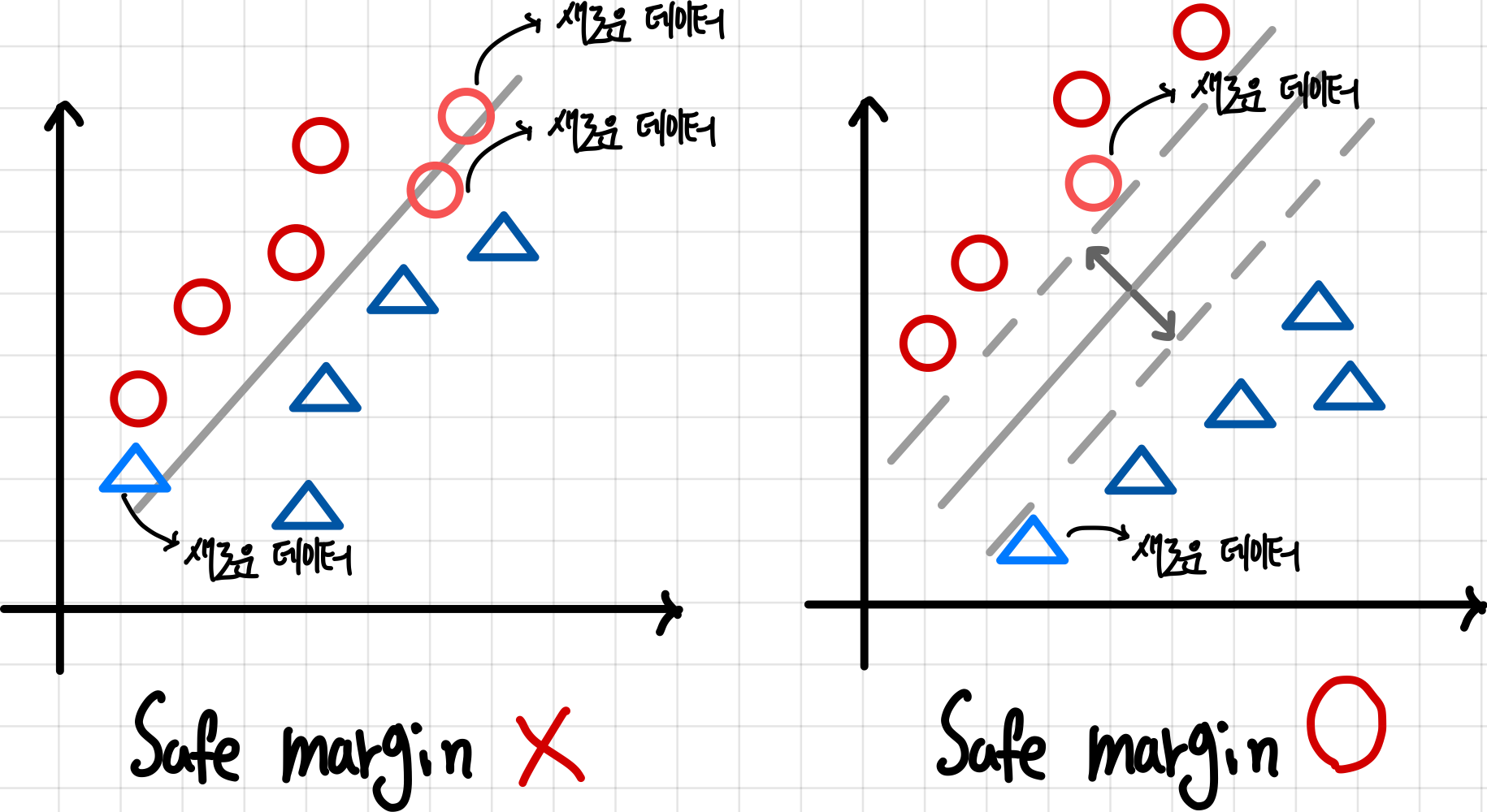 왼쪽은 Safe margin(1)이 없어서 새로운 데이터가 선형 분류기를 넘어갈 수 있다. 이렇게 되면 제대로된 데이터 분류가 되지 않을 수 있어 성능이 안정적이지 못하다.