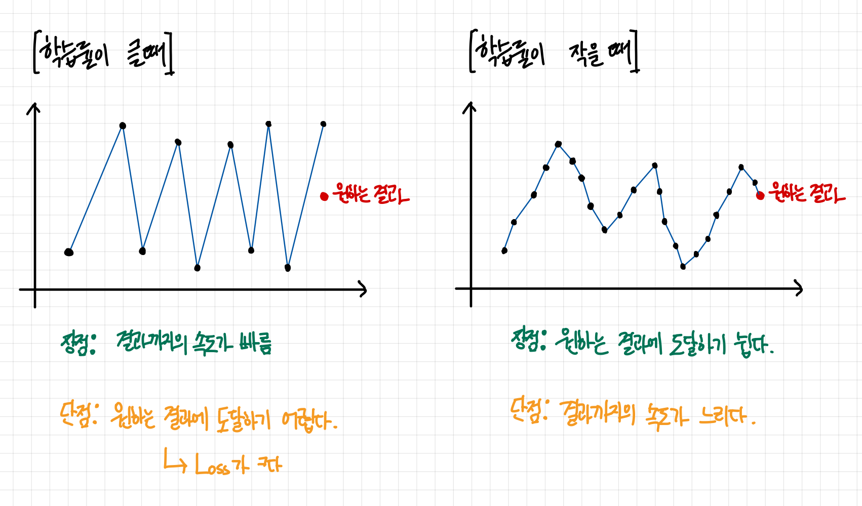 즉, 학습률이 클때는 빠르게 결과까지 도달할 수는 있지만 정확한 값에 도달하기는 어렵다.