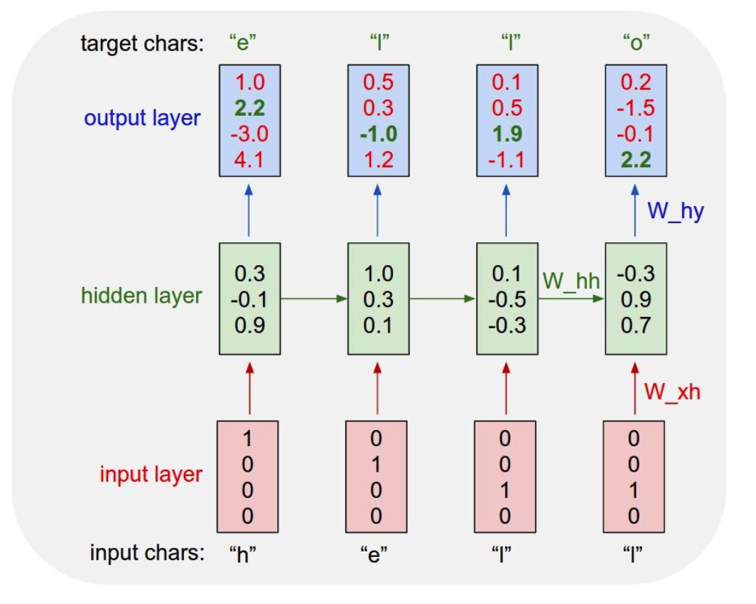 즉, 이전 입력값이 다르기 때문이다. 첫 l은 이전에 e가 입력값으로 주어진다. 따라서, 다음 값을 l로 예측했고 다음 l은 이전 값이 l이기 때문에 다음 값을 o로 예측한 것이다.