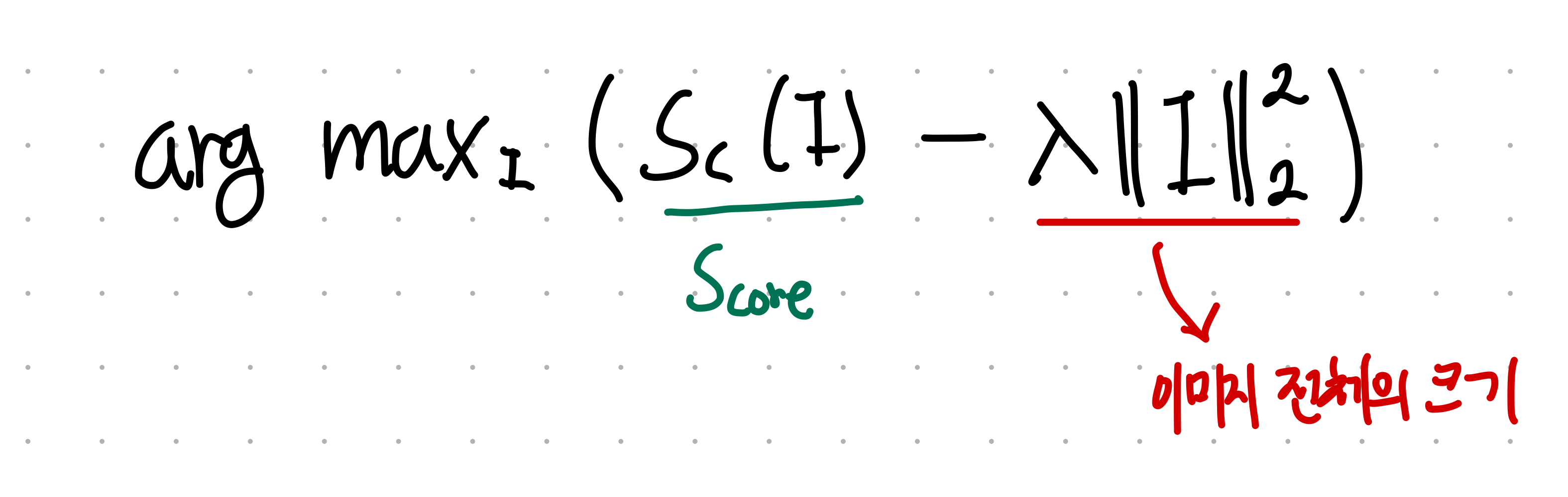 위 식의 의미는 arg max(특정 클래스에 대해서 최대 스코어를 갖는 이미지 - 이미지 크기)라고 할 수 있다.