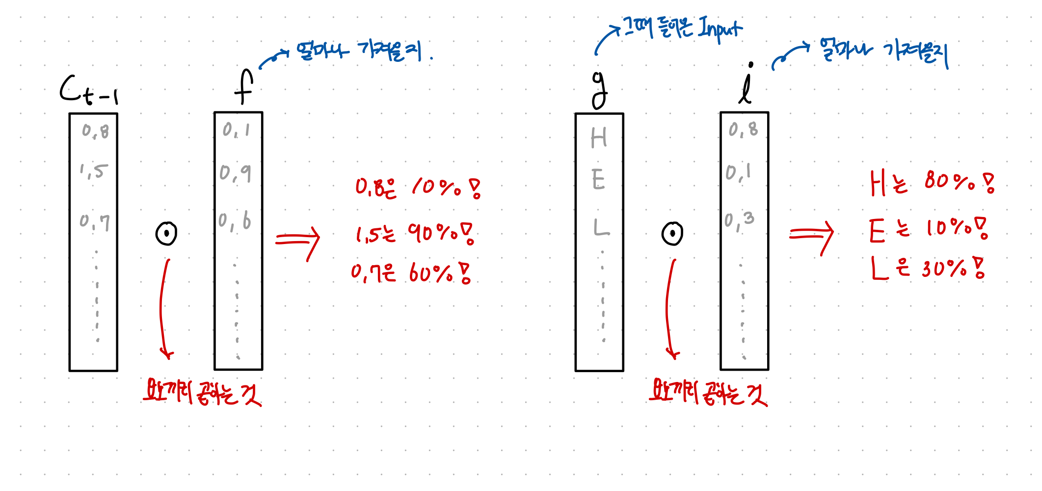 위의 사진과 같이 이전 cell state에서 중요한 부분만 일부분 추출하고, 당시에 들어온 입력 값(g)중 중요한 일부분을 추출해서 그 값을 더해서 새로운 cell state를 업데이트한다.