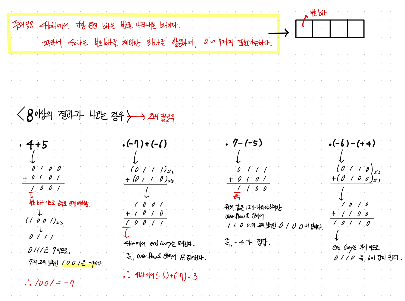 4bit에서 가장 왼쪽의 bit는 부호 비트이기 때문에 실제 4bit는 0~7까지의 숫자만 표현이 된다.