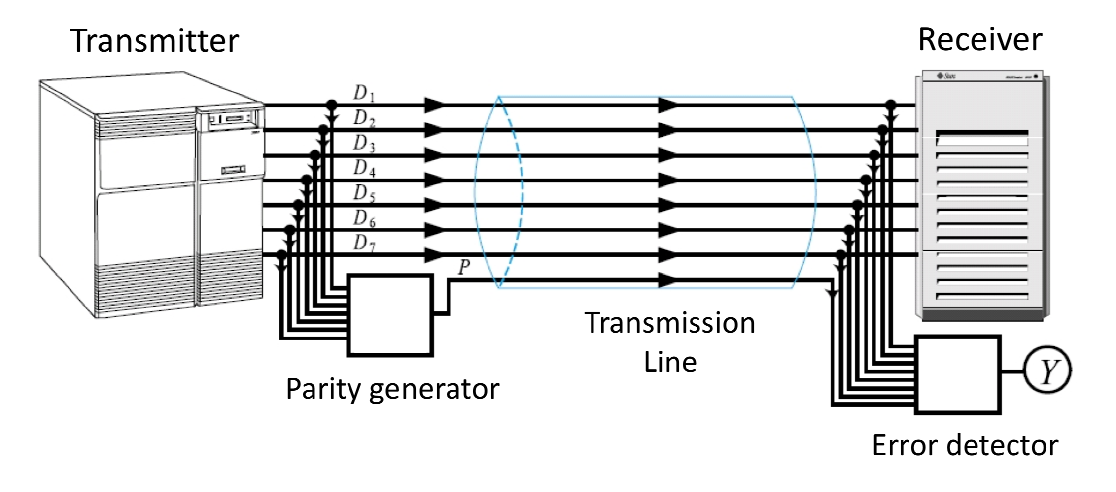 Transmitter에서 D1, D2, D3, D4, D5, D6, D7의 입력 값을 보냈을 때, Reciver에서 제대로 값이 왔는지 알고 싶다고 해보자. 즉, Transmission Line에서 에러가 발생했는지 알고 싶다고 해보자.