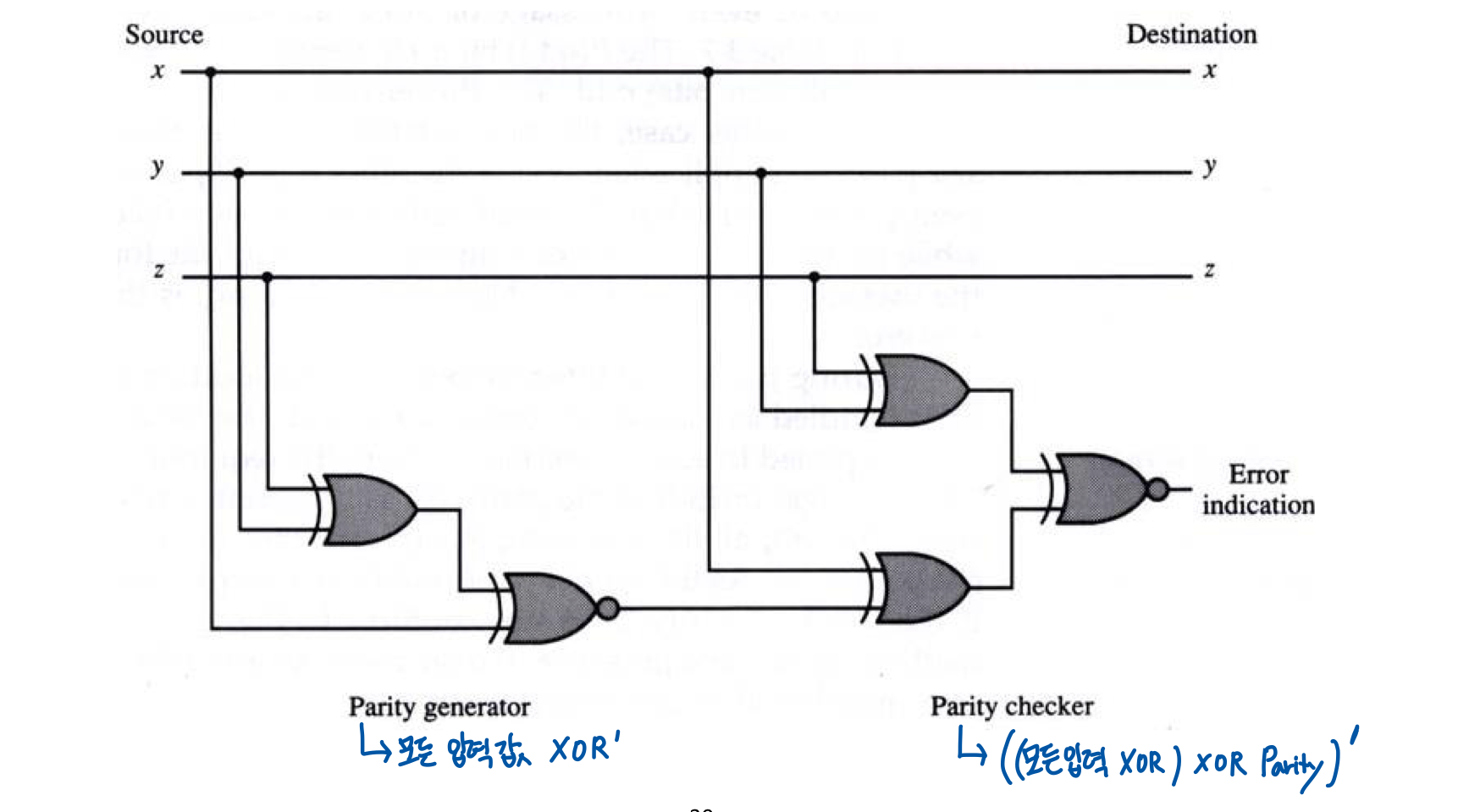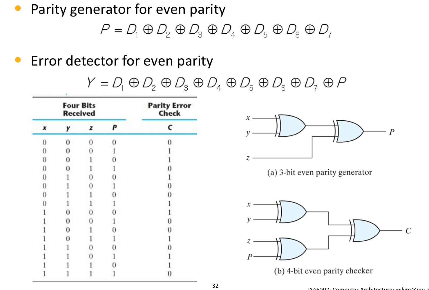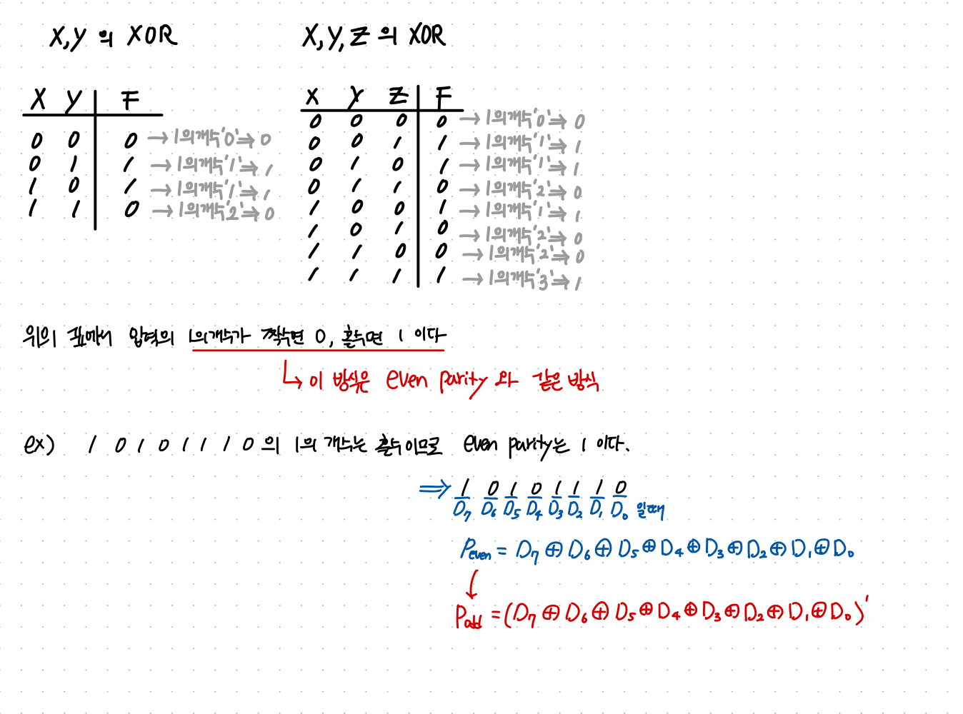 따라서, 모든 입력값을 XOR한 출력은 Even Parity의 값이 되고, 모든 입력값을 XOR한 출력의 not 은 Odd Parity의 값이 된다.