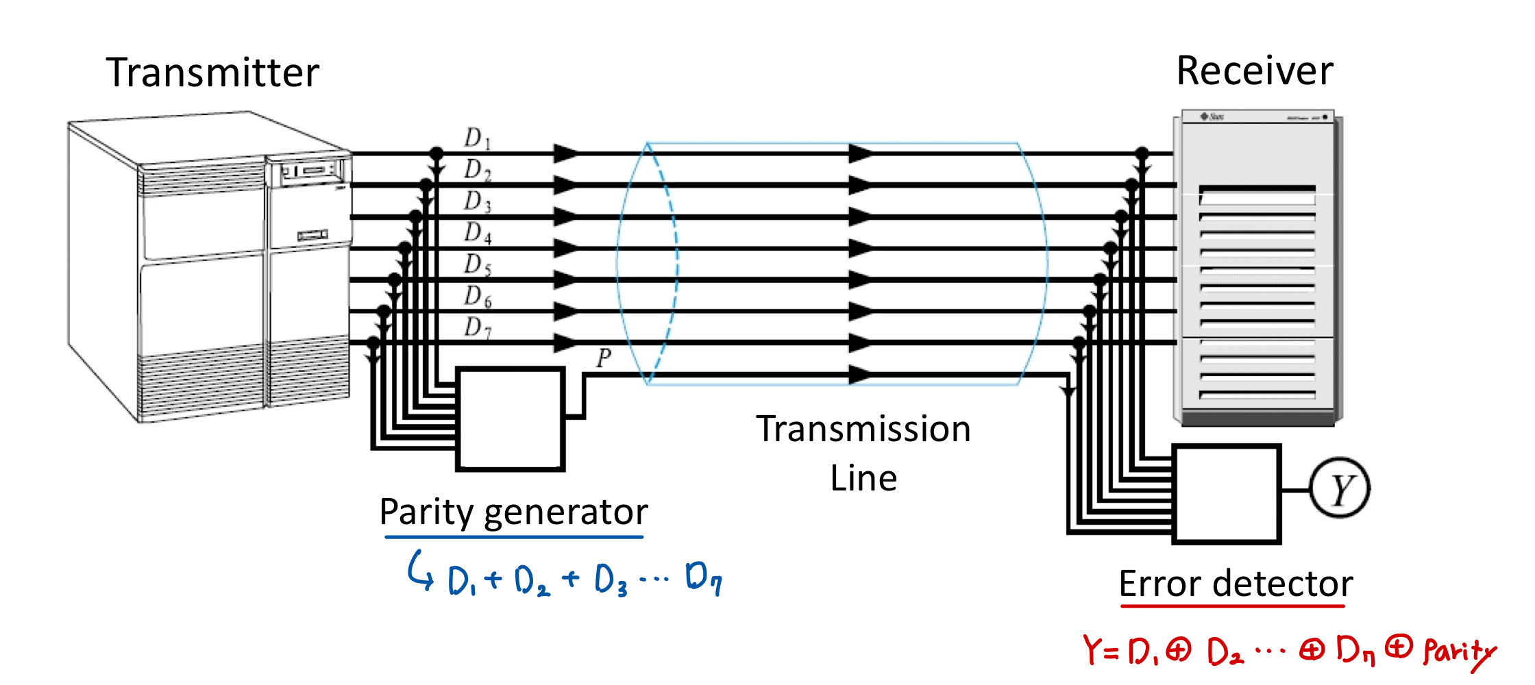 Transmitter에서 D1, D2, D3, D4, D5, D6, D7의 입력 값을 보냈을 때, Reciver에서 제대로 값이 왔는지 알고 싶다고 해보자. 즉, Transmission Line에서 에러가 발생했는지 알고 싶다고 해보자.