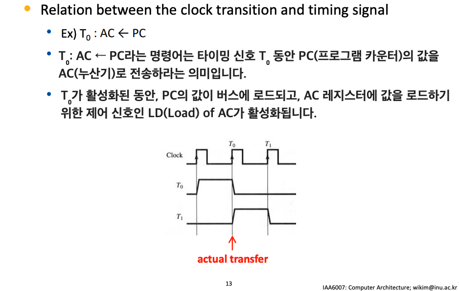여기서 중요한 것은 실제 데이터 전송은 클럭이 상승하는 순간 발생한다. 클럭의 신호는 주기적으로 변경되는데, T₀ 단계에서는 PC의 값이 bus에 로드되고, 클럭이 상승하는 순간 PC 값이 AC에 로드된다.