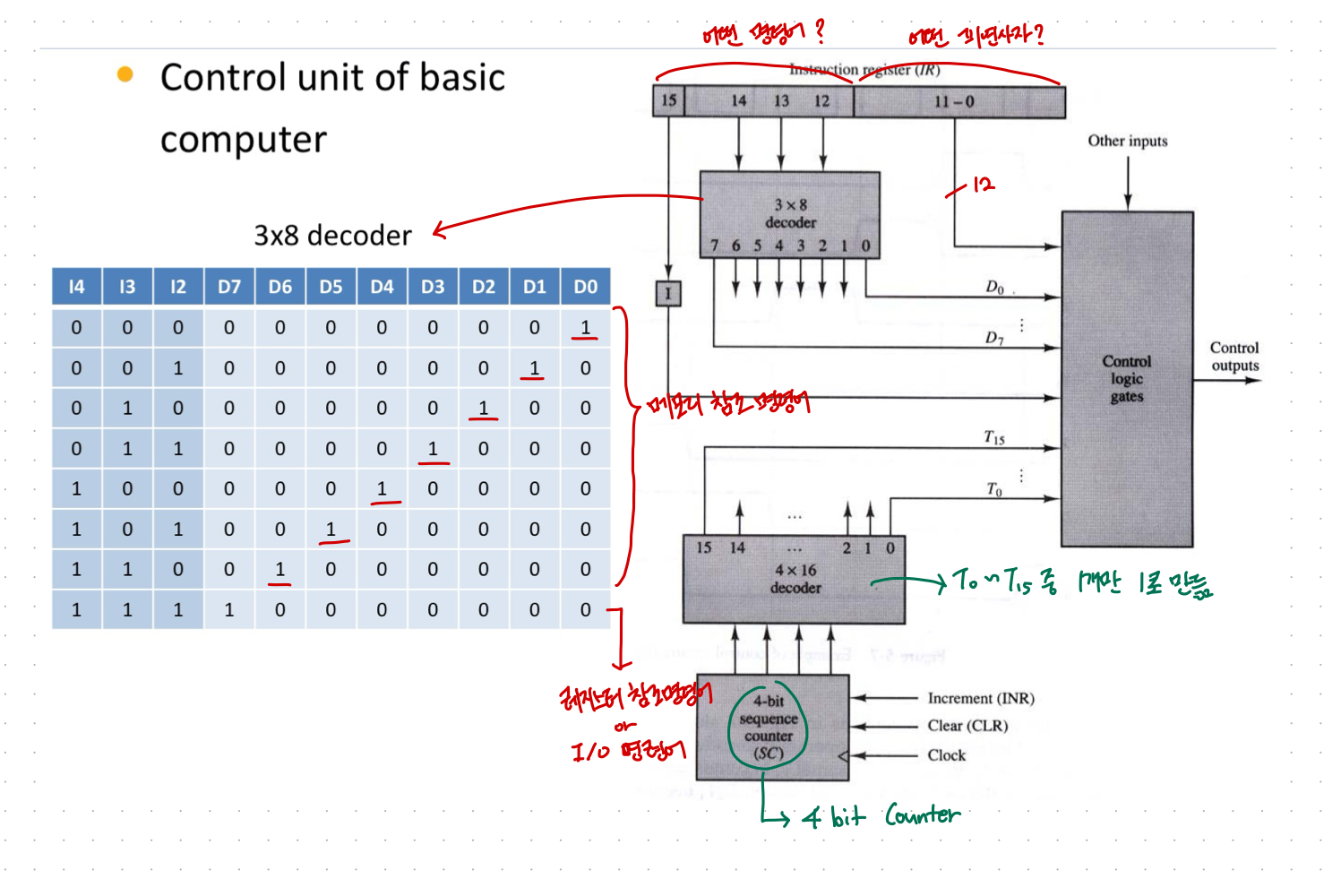 : 디코더에서 나온 신호를 기반으로 제어 논리가 구성되어 CPU 내부 작업 흐름을 제어하는 신호를 생성한다.