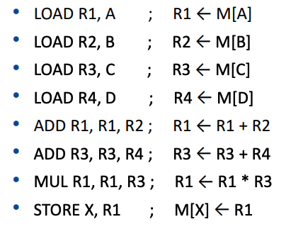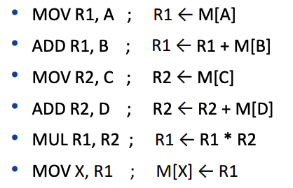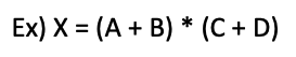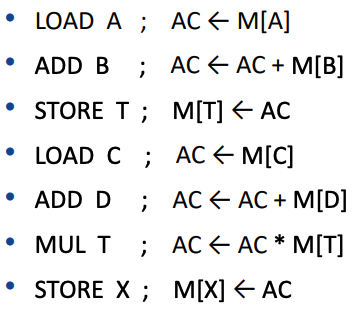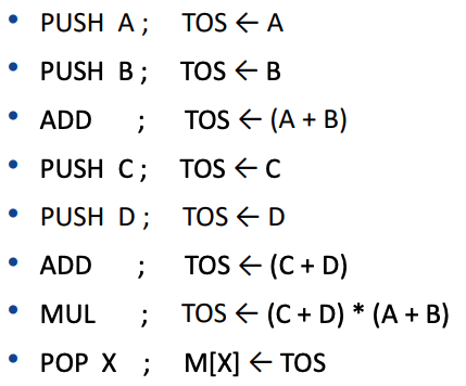 위의 형식을 말로 풀어서 설명하면 A의 값을 TOS에 넣고 B의 값을 TOS에 넣고 그것을 더한 값을 TOS에 넣는다. 이런식으로 나머지도 수행하고 마지막에 POP은 모든 연산의 결과인 TOS를 X의 주소를 가진 메모리에 저장한다.