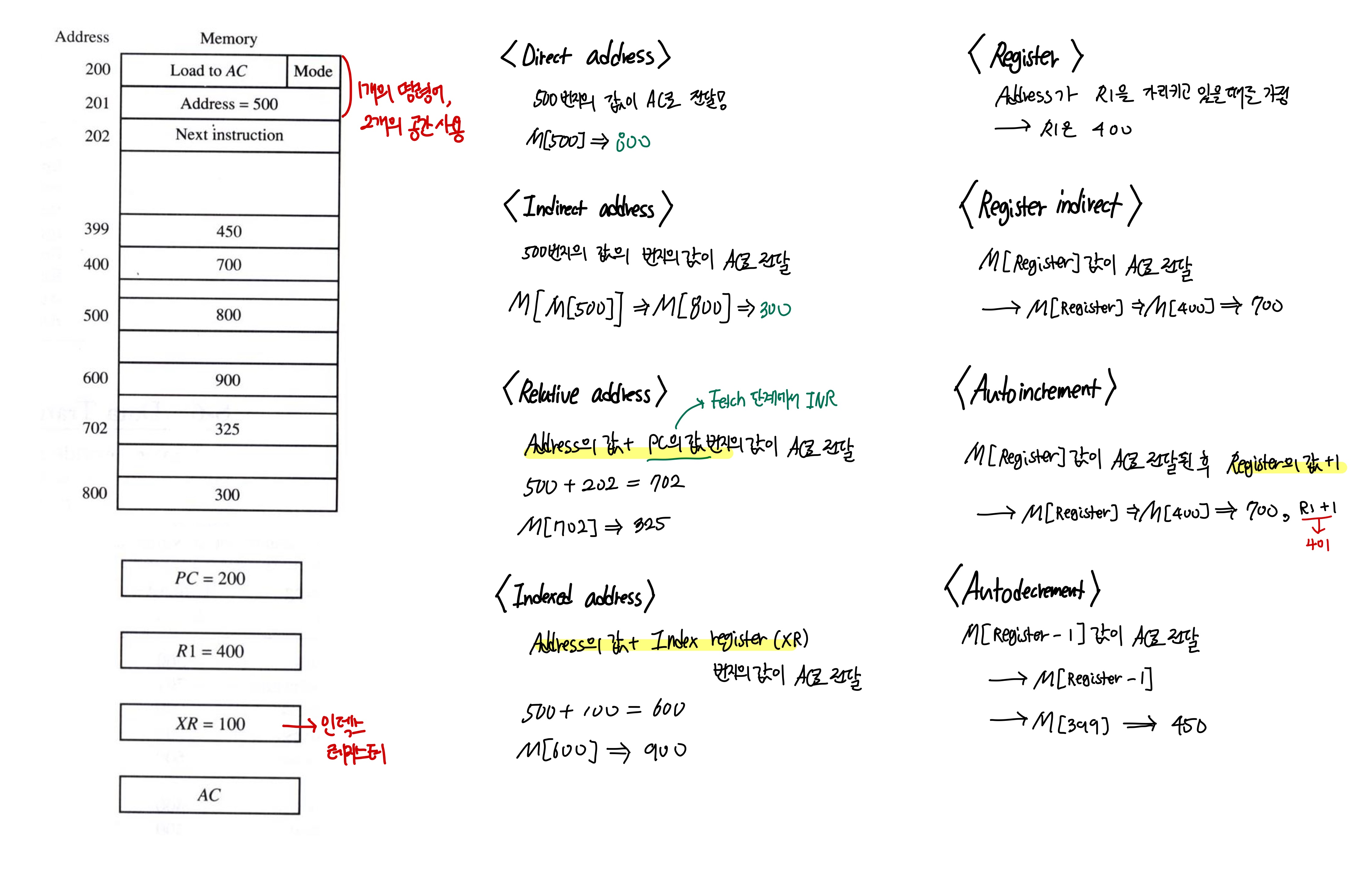 | Indirect Address Mode | 명령어가 가리키는 메모리 주소 안에 실제 데이터 주소가 저장되어 있음. | ADD R1, (A) (A는 데이터 주소) |