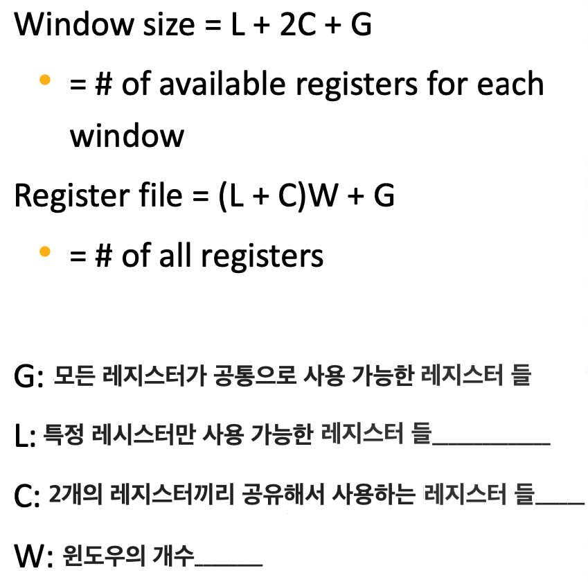 Register file = 글로벌 영역의 레지스터 개수(10개) + 윈도우 개수(4개) * (로컬의 개수 (10개) + 공통 영역의 개수 (6개)) = 74