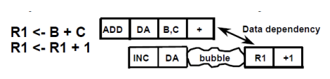 B, C의 덧셈 연산이 되지 않았을 때 R1을 증가하면 충돌이 일어날 수 있다. 따라서, bubble(지연)을 통해서 연산 결과가 R1에 저장되고 난 후에 R1을 증가시키면 이를 방지할 수 있다.