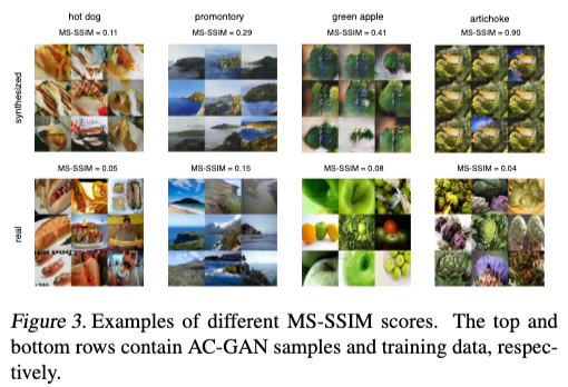 - 이를 비교해보면, 예컨대 artichoke 클래스의 생성 이미지는 높은 MS-SSIM 점수(=이미지들끼리 서로 비슷)가 나타나, 다양성이 낮다는 점을 알 수 있다는 내용입니다