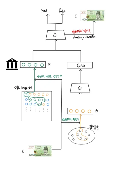 - 판별 모델은 이미지가 진짜인지 아닌지와 동시에, 클래스 정보에 맞는 이미지인지도 확인을 하여 생성 모델에게 피드백을 제공한다.