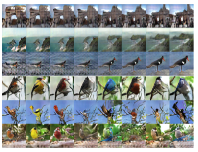 - 잠재 벡터 사이를 선형으로 연결해서 중간 지점을 계산하여 점점 다른 이미지로 변환되도록 하는 것이다.