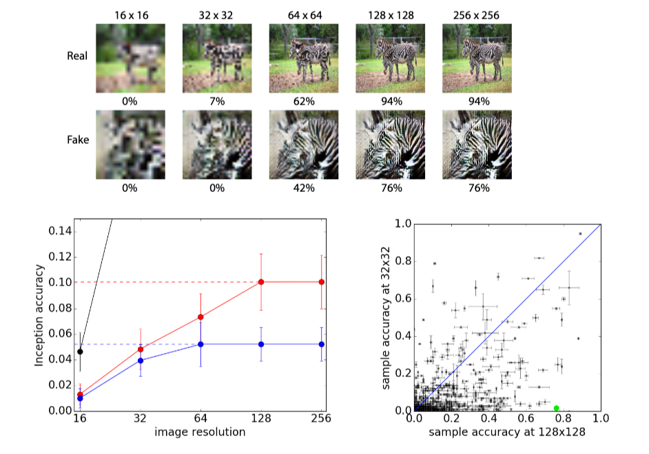 저해상도 이미지를 단순히 크기를 늘리는 것만으로는 구별 가능성을 높일 수 없으며, 고해상도 이미지를 생성해야 구별 가능성이 향상된다. AC-GAN 모델은 고해상도 이미지를 생성하는 데 성공적으로 구별 가능성을 높이는 성능을 보여주고 있다. 즉, 128 × 128 해상도의 이미지를 생성할 때 더 높은 정확도를 달성하여, 클래스 간의 구별이 더 잘 이루게 만들었다.