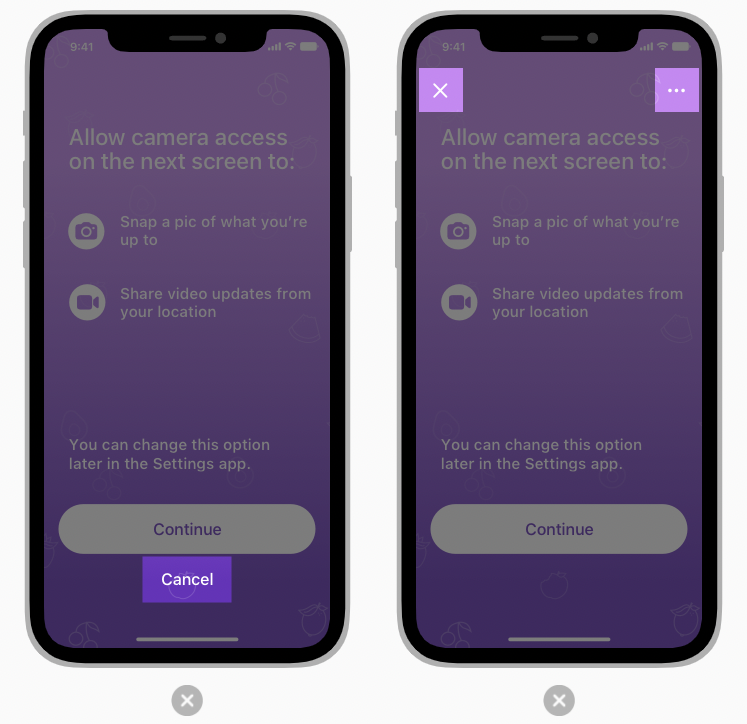 사람들은 때때로 알림을 읽지 않고 무시하기 위해 빠르게 탭한다. 이러한 행동을 이용하여 선택에 영향을 미치는 맞춤형 메시지 화면은 App Store 검토에서 거부될 것이다. Displaying a Custom Screen Before a Permission Alert.