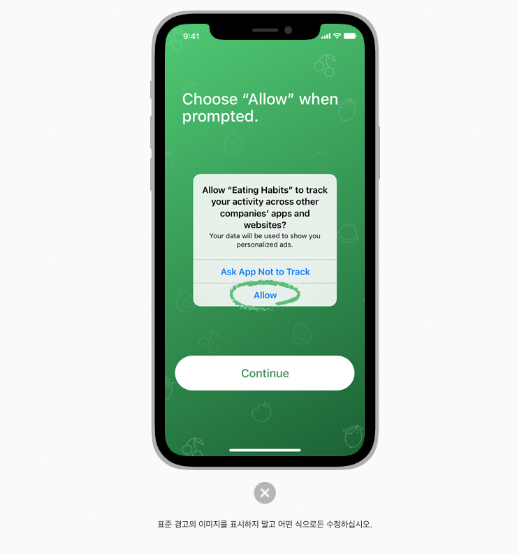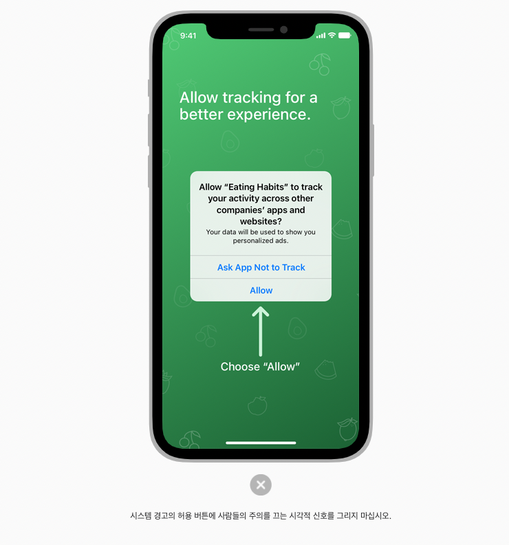 앱에 정보가 필요한 이유가 분명할 때 사람들은 시작 시간 요청으로 인해 방해를 받을 가능성이 적다. 사람들이 앱을 실행하는 즉시 앱 추적을 수행하려면 추적 데이터를 수집하기 전에 시스템 제공 경고를 표시해야한다.