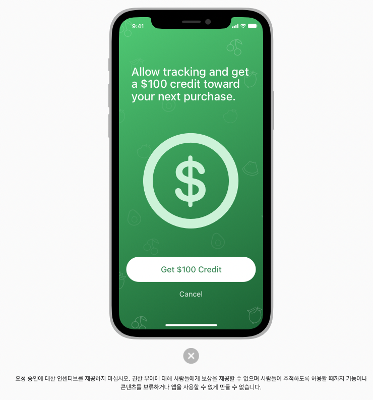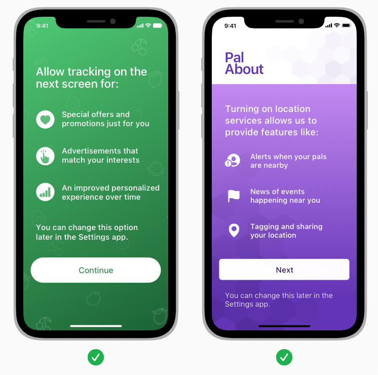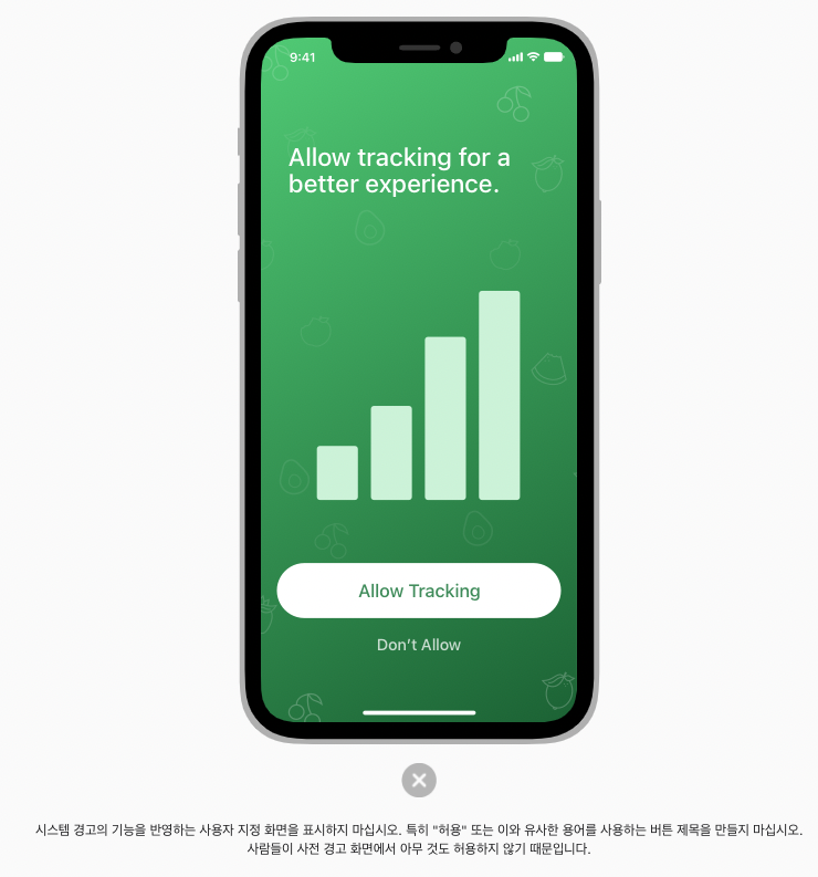 앱 추적은 민감한 문제이다. 어떤 경우에는 추적의 이점을 명확하게 설명하는 사용자 정의 화면을 표시하는 것이 합리적일 수 있다.