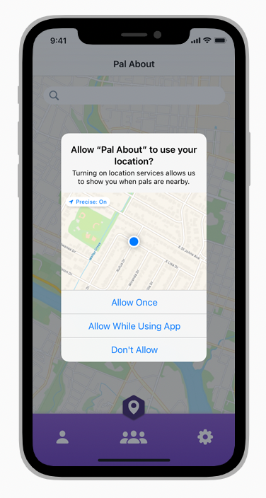 사람들이 앱을 처음 열고 위치 버튼을 탭하면 시스템에 표준 알림이 표시된다. 알림은 사람들이 버튼을 사용하여 앱의 위치 액세스를 제한하는 방법을 이해하고 공유가 시작될 때 나타나는 위치 표시기를 상기시킨다.