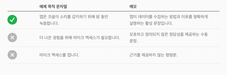 앱이 요청하는 데이터 또는 리소스를 사용하는 방식을 명확하게 설명하는 문구를 작성해라.