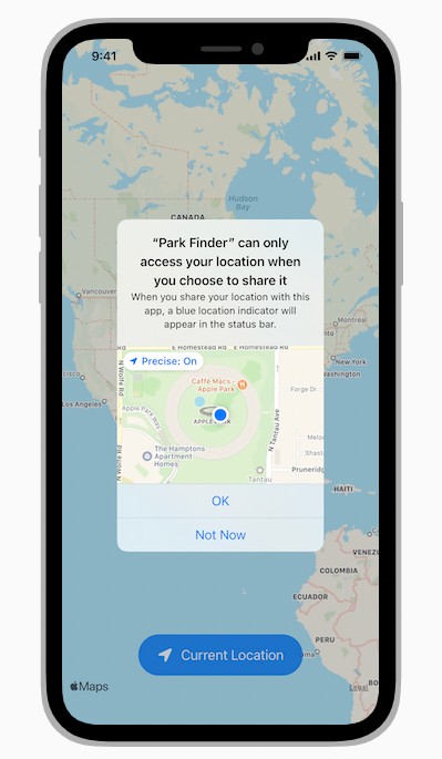 사람들이 앱을 처음 열고 위치 버튼을 탭하면 시스템에 표준 알림이 표시된다. 알림은 사람들이 버튼을 사용하여 앱의 위치 액세스를 제한하는 방법을 이해하고 공유가 시작될 때 나타나는 위치 표시기를 상기시킨다.