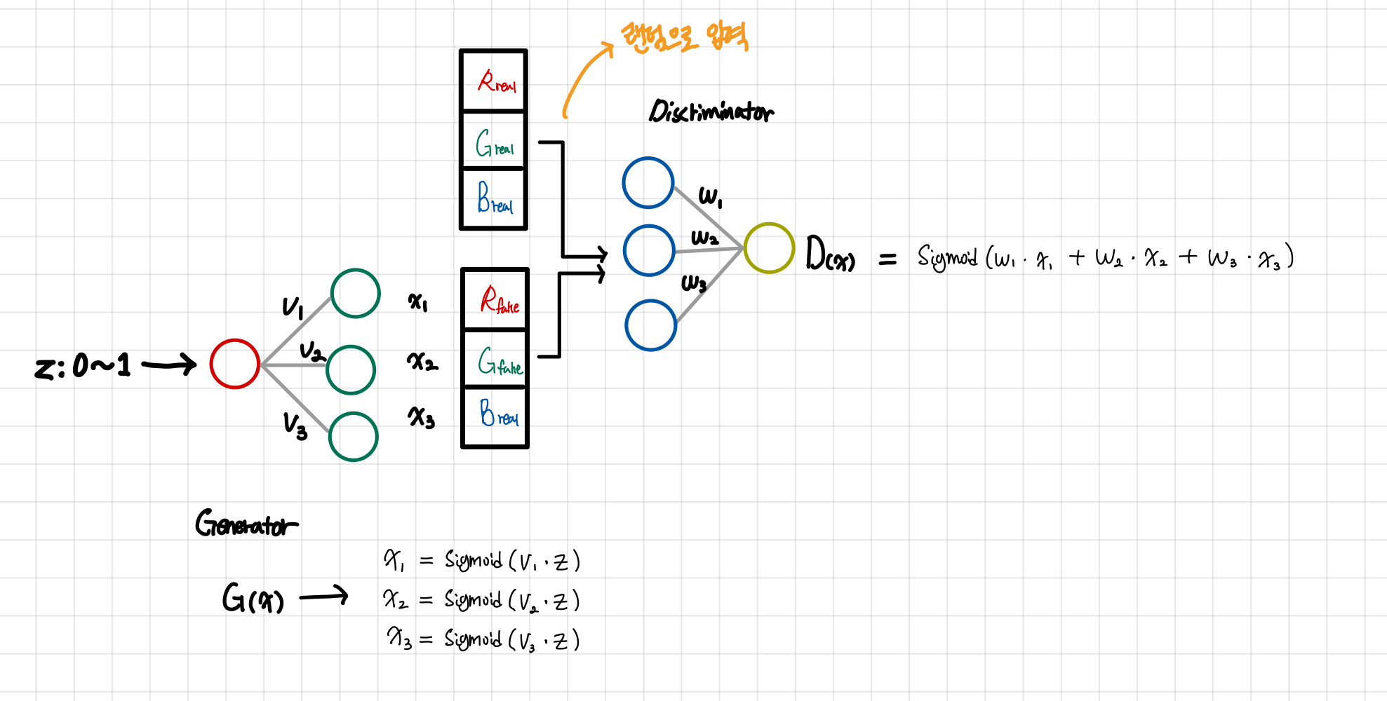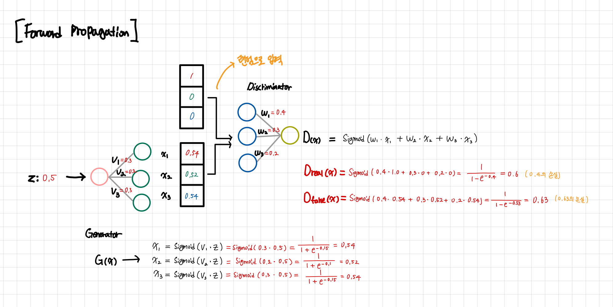 위와 같은 싱글 Layer 신경망을 가지는 Genrator와 Discriminator를 가지는 GAN이 있을 때 순전파와 역전파를 통해서 서로 어떻게 가중치를 업데이트하면서 성장하는지 알아보자.