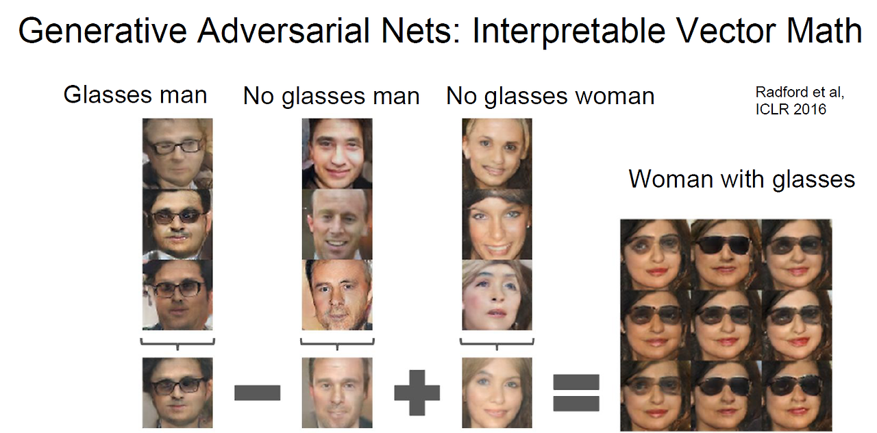 이후, '안경을 쓰지 않은 여성' 이미지에 이 '안경 특성 벡터'를 더하면, 그 여성 이미지에도 안경이 추가된 것처럼 변형된다. 결과적으로 GAN은 잠재 공간(중요한 특성을 압축하여 표현하는 공간)에서 '안경'이라는 속성을 다른 이미지에 전이하여 적용할 수 있게 된다.