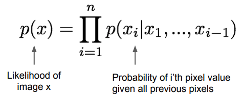 수식으로 본다면 이미지 전체 확률 p(x)를 계산할 때, 이미지를 구성하는 각 픽셀들이 이전에 생성된 pixel에 의존해서 순서대로 값을 갖게 된다.