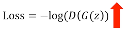 Generator에서는 Discriminator의 출력이 1이 되도록 학습하는 것이 목표이다. 따라서 위 D(G(z))를 최대화 하는 것이 목표이다. 즉, 로그의 값이 커질 수록 Loss의 값이 줄어들기 때문에 로그의 값을 최대화 하는 것이 목표이다.