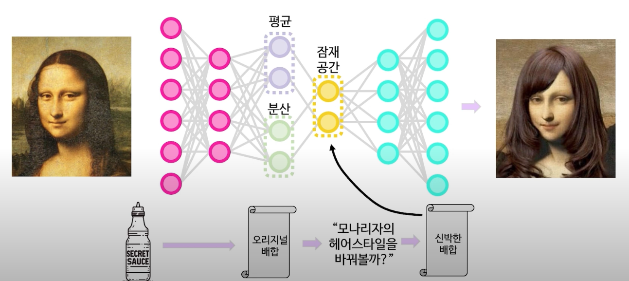 : 이미지를 압축하여 중요한 특징을 담은 벡터(latent space)로 만들고, 이 벡터를 사용해 이미지를 다시 생성할 때, 무작위성을 부여해서 원래의 이미지만 복원하는게 아니라 원래 이미지와 비슷하지만 조금씩 다른 버전도 만드는 것이다.