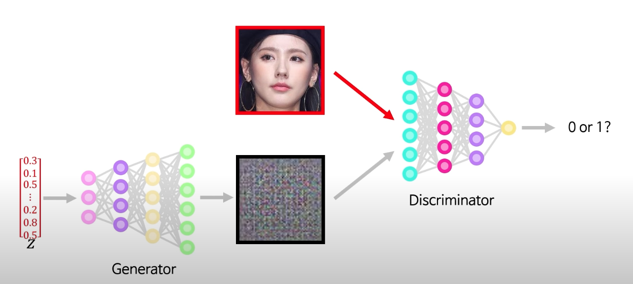 : Generator(fake 데이터 생성자)와 Discriminator(fake 데이터 감별사)가 서로 경쟁하면서 Generator(fake 데이터 생성자)는 좀 더 진짜와 같은 데이터를 생성하도록 발전하고, Discriminator(fake 데이터 감별사)는 fake 데이터를 더 예민하게 판별하도록 성장하는 것이 GAN의 개념이다.
