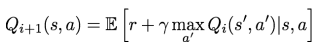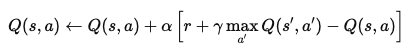 이때 Q(s, a)는 위의 공식으로 업데이트 된다. 위 식은 현재 State에서 받은 보상 r과 다음 상태 s'에서 최적의 행동을 했을 때 기대되는 보상을 합쳐서 Q(s, a)를 업데이트하는 방식이다.
