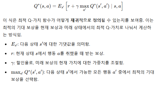 현재 State s와 현재 Action a에서의 보상 r과 다음 상태 s'에서의 최대 보상의 누적 예상 값을 maxQ*(s', a')로 나눠서 표현했다. Q*(s', a')로 인해서 또 다음 Q*(s'', a'')가 호출되는 재귀적인 형태로, 최적 Policy를 따를 때 모든 State-Action 쌍에 대해 최적의 기대 보상을 계산할 수 있도록 한다 .