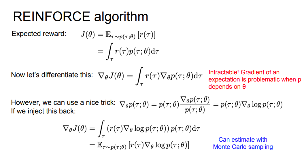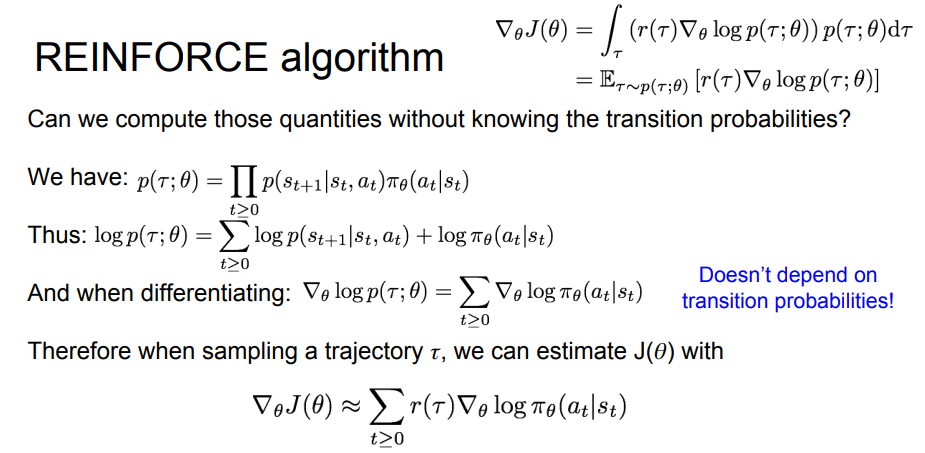 - REINFORCE 알고리즘의 장점은, 정확한 전이 확률(다음 상태로 이동할 확률)을 몰라도 학습할 수 있다는 것이다.