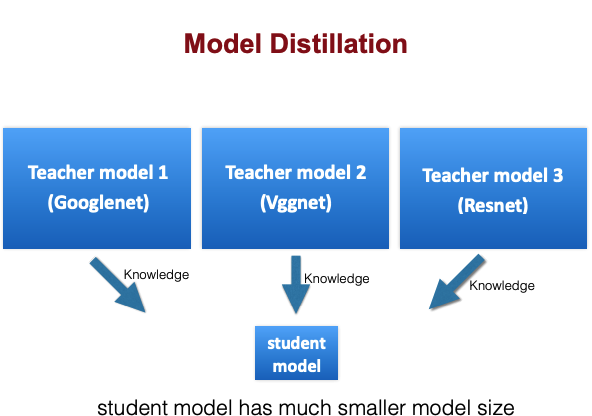 - 큰 모델의 복잡한 지식을 작은 모델에 전이시키는 기법. 큰 모델(Teacher)에서 예측 확률을 기반으로 작은 모델(Student)이 학습함으로써 더 작고 효율적인 모델을 생성한다.