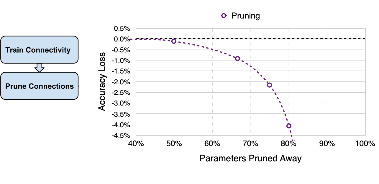 AlexNet과 같은 모델에서 Pruning을 통해서 불필요한 가중치를 10배 줄이면서 정확도 손손 없이 모델을 경량화했다.