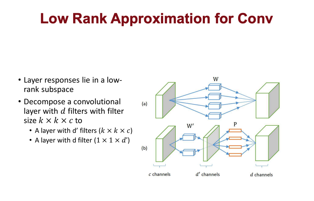 CNN의 Conv 레이어에서 필터의 가중치 행렬을 저차원으로 근사로 표현하여 연산량을 절감할 수 있다.
