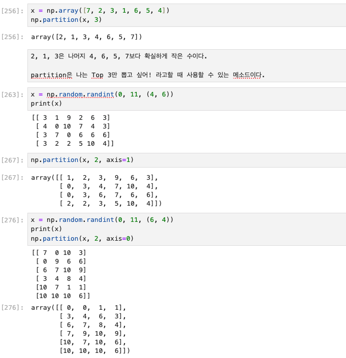 np.partition(배열, num): [0 ~ num-1]는 [num ~ last]보다 확실하게 작은 수로 구성되어 있음을 보장한다. 단, 각 구간 내의 정렬은 보장하지 않는다.