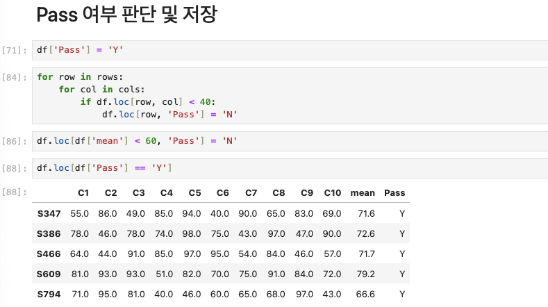또한, 각 행의 mean 컬럼의 값이 60보다 작은 값이라면 Pass에 N을 추가했다.