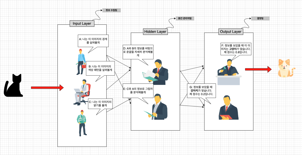 은닉층은 입력층에서 처리된 기본 정보를 기반으로 더 복잡한 특징을 학습한다. 은닉층을 중간 관리자들이 모인 팀으로 비유할 수 있다. 각 은닉층의 뉴런들은 입력층에서 나온 정보를 다시 조합해서 새로운 통찰을 얻는다.