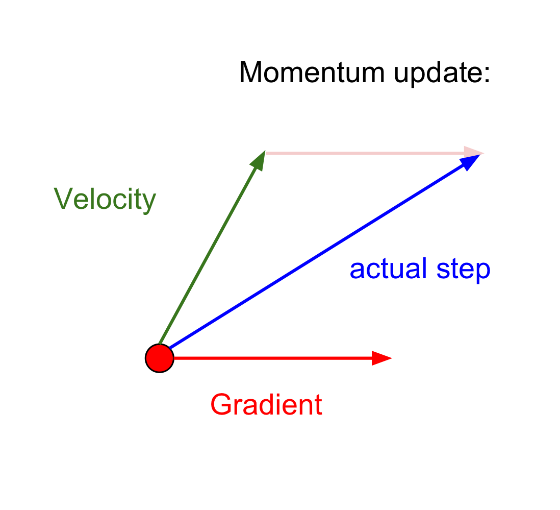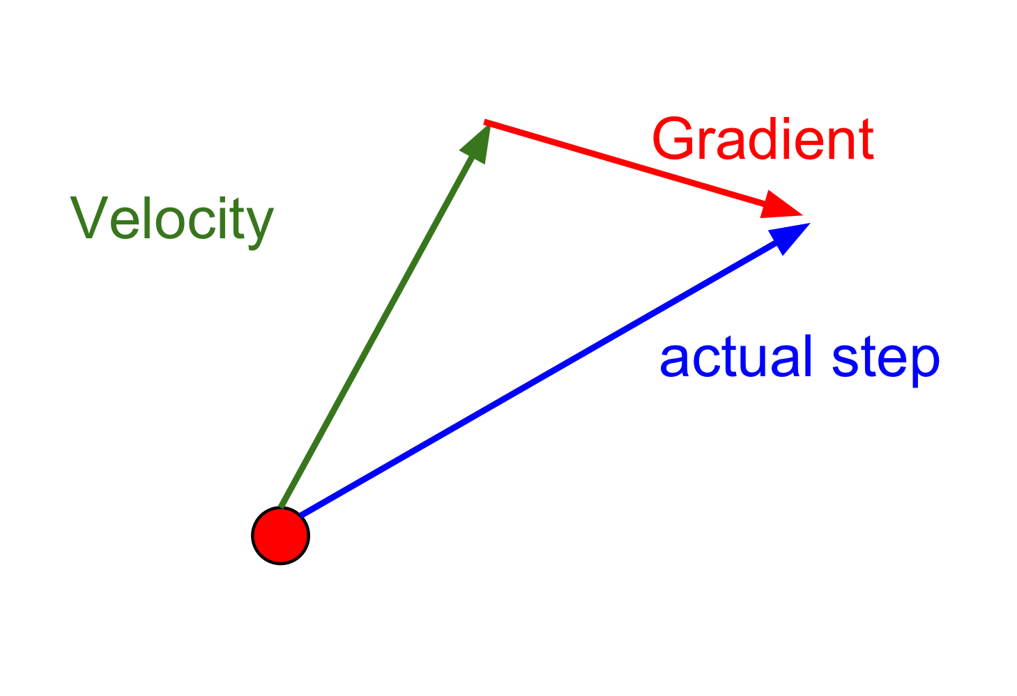 위의 사진을 해석하면 예를 들어 (0, 0)에서 속도가 간 지점(이전 스텝)과 또 (0, 0)에서 구한 기울기를 더해 계산된 새로운 지점이 다음 스텝에서 사용할 속도가 되는 것이다.