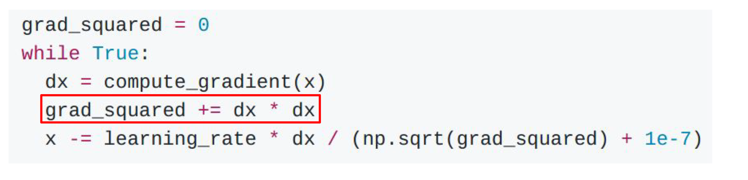 x -= learning_rate * dx / (np.sqrt(grad_squared) + 1e-7)