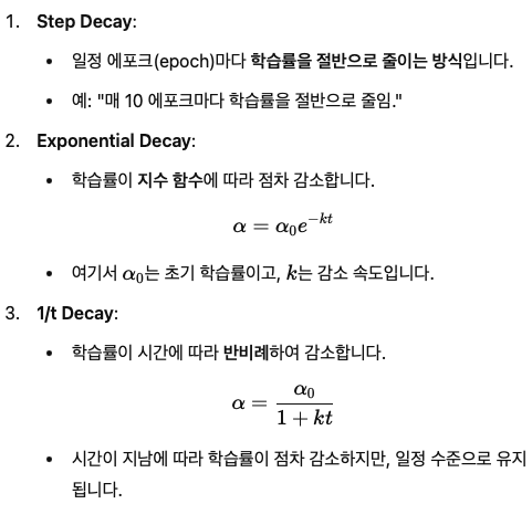 매우 작은 학습률: 때로는 너무 작은 학습률을 적용할 수 있어서, 충분한 학습이 이루어지지 않는 경우가 발생할 수 있다