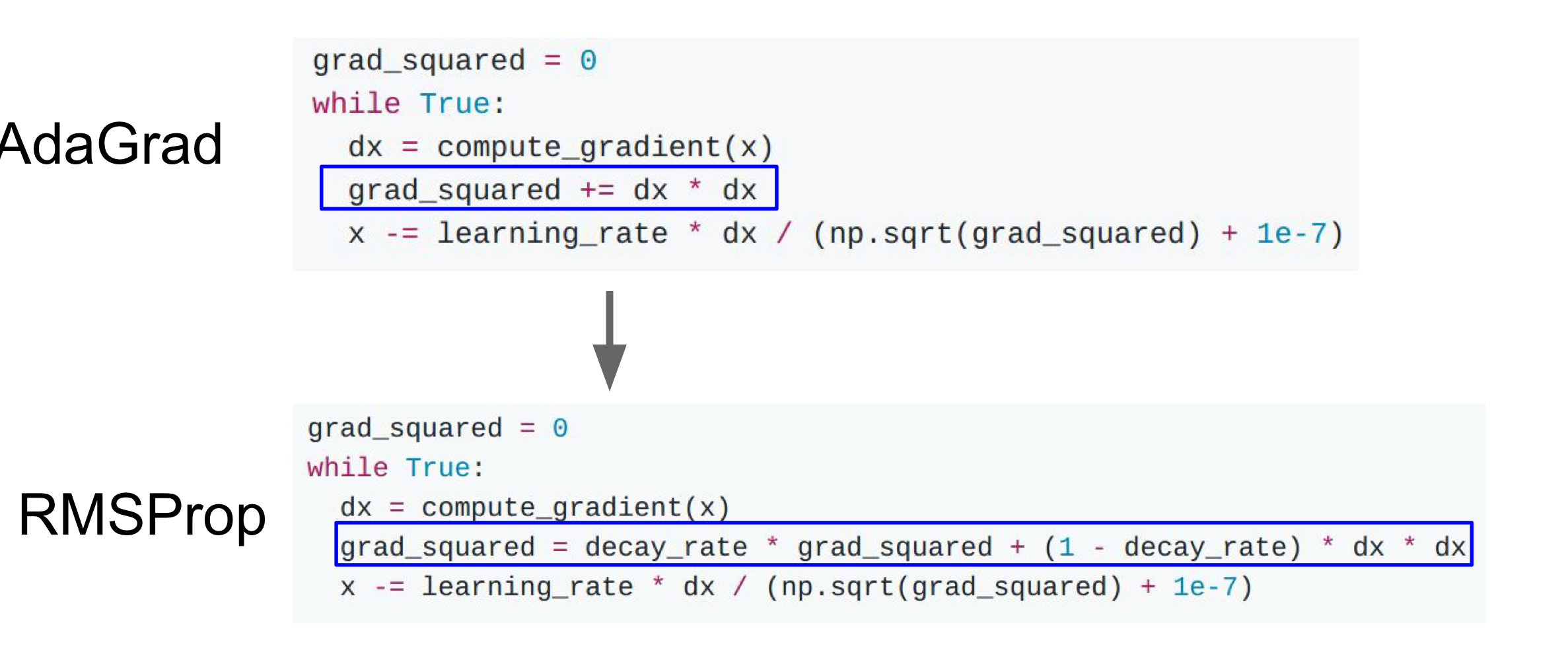 AdaGrad의 단점인 시간이 지나면 학습률이 매우 떨어지게 된다는 단점을 보안한 방법이 바로 RMSProp update이다.