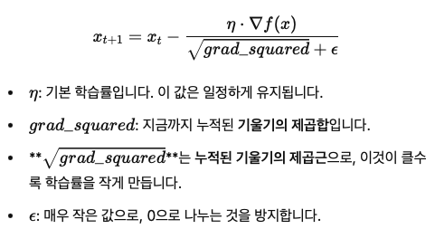 학습률이 너무 빠르게 줄어듦: 시간이 지남에 따라 기울기 제곱합이 계속 누적되면 학습률이 매우 작아져 더 이상 진행되지 않을 수 있다.