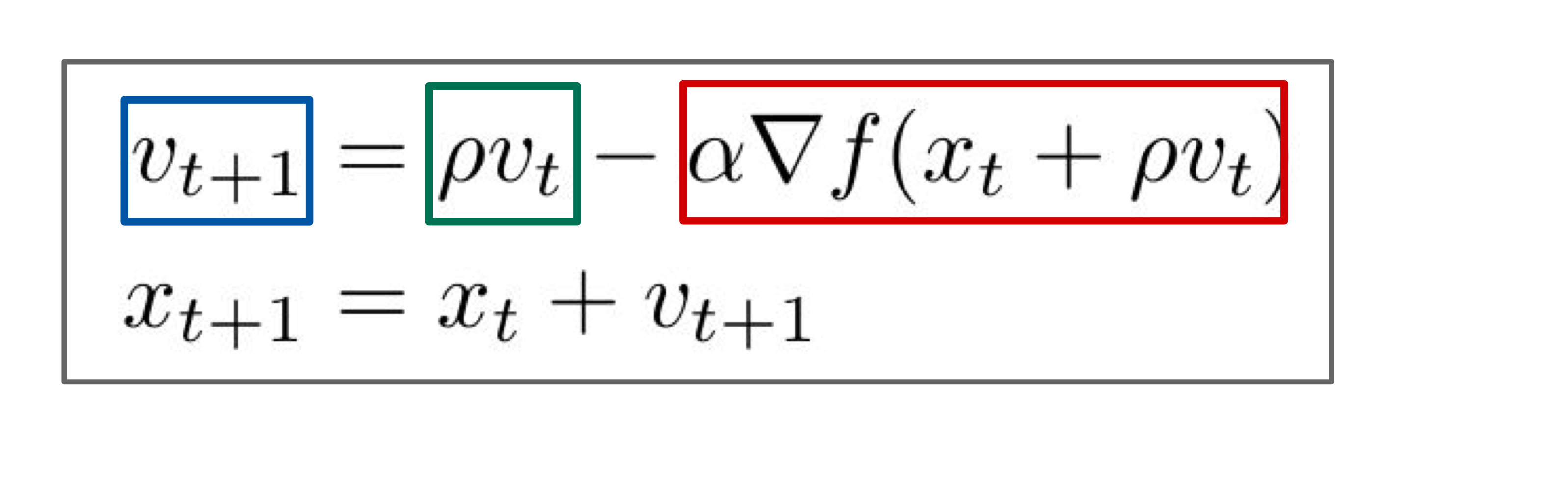 Nesterov Momentum update는 다르게 속도를 도출한다.