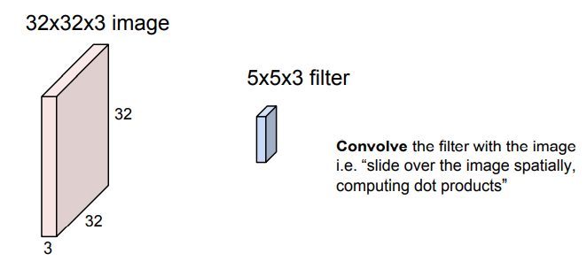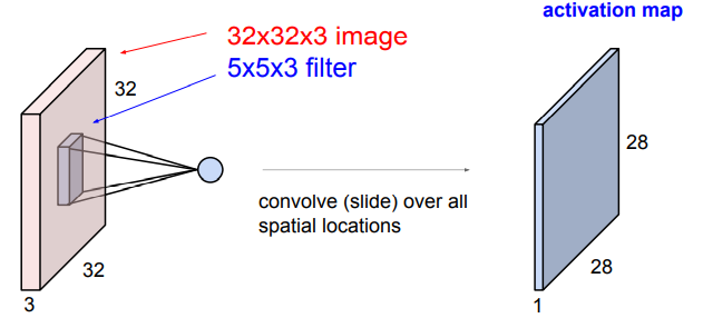 5x5x3 Filter가 입력 받은 32x32x3 사진을 순차적으로 훓으면서 필터가 해당 되는 이미지의 부분과 필터를 dot product 연산을 적용해서 하나의 수를 도출한다.