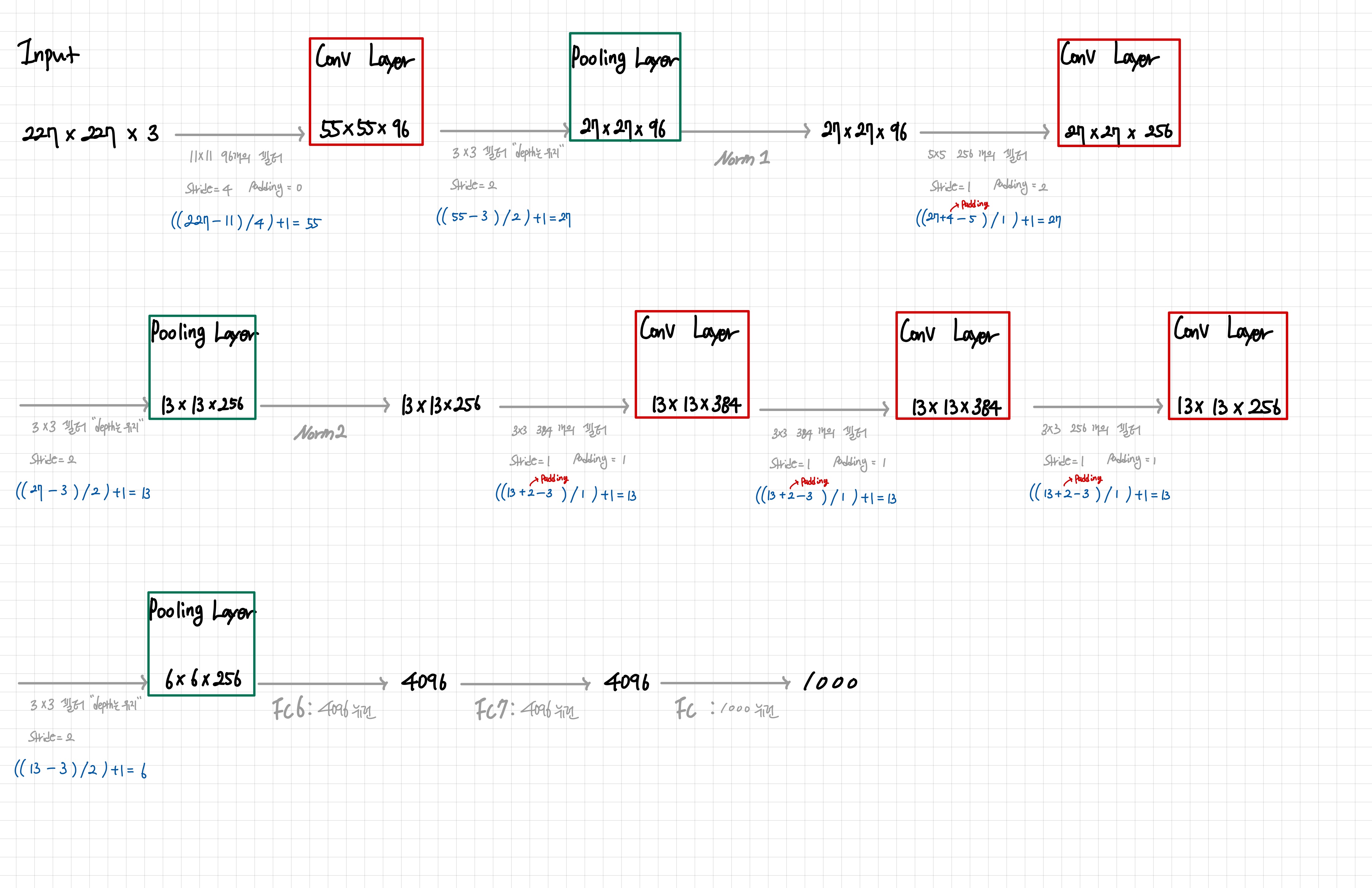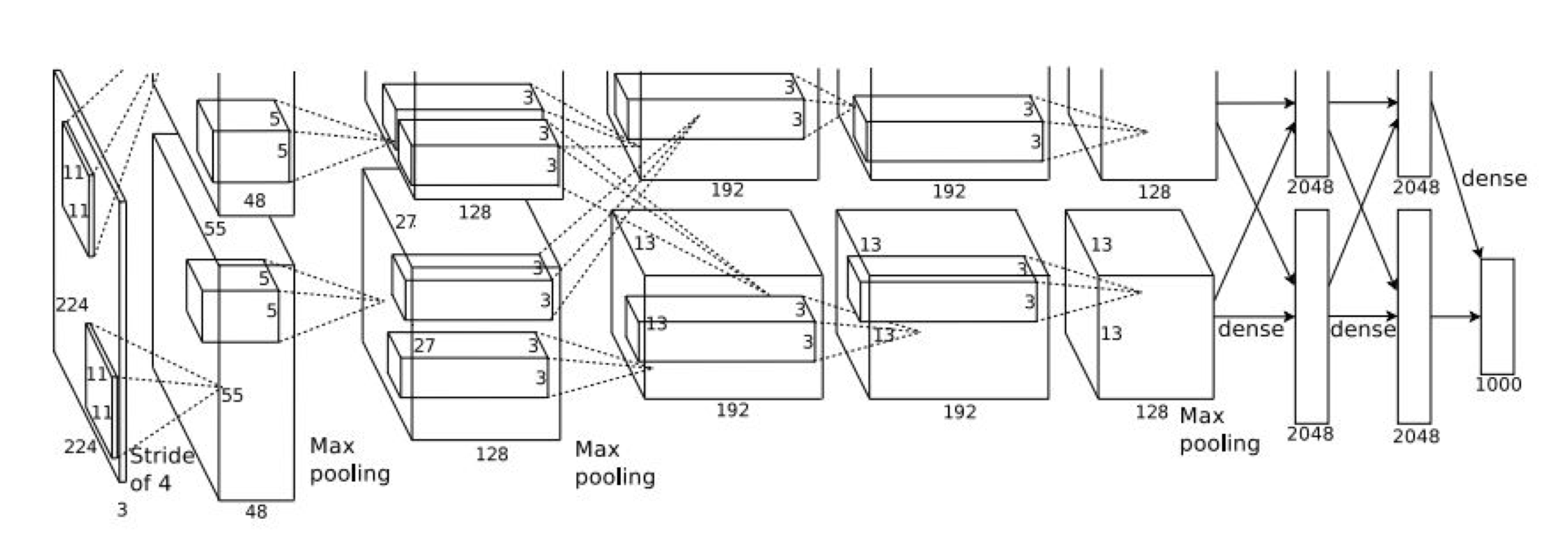 227x227x3 크기의 input이 들어가고 filter는 11x11 크기가 96개 (stride는 4) 있다. ((227 - 11) / 4) + 1 = 55이다.